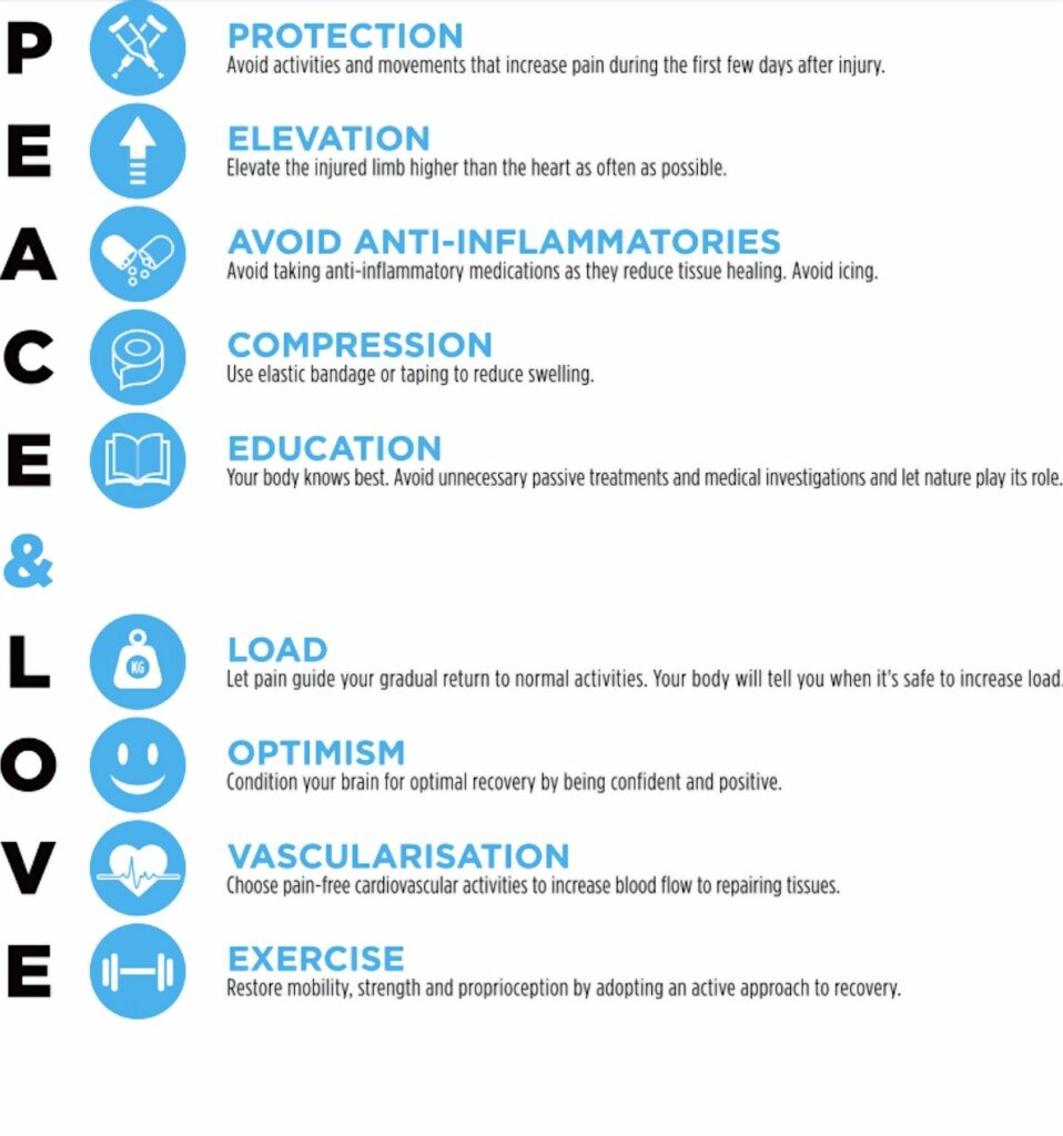 Il protocollo POLICE è stato un primo passo verso una gestione più attiva dell’infortunio, ma gli studi sull’argomento sono andati avanti, portando alla creazione del protocollo PEACE & LOVE. Questo protocollo tiene conto non solo del carico precoce dell’arto leso, ma anche dell’aspetto psico-sociale del paziente e del suo problema.